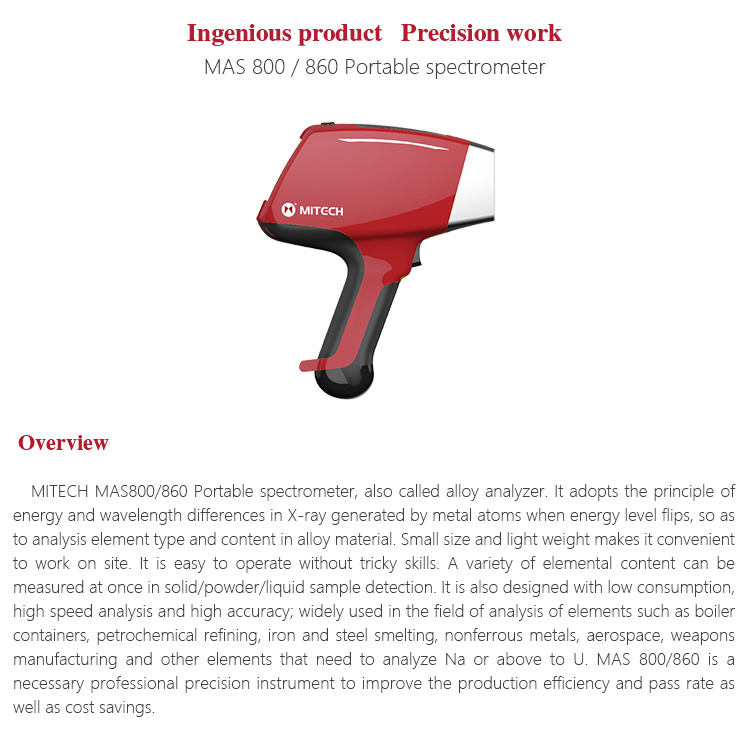 Product OverviewMITECH MAS800 Portable spectrometer, also called alloy analyzer. It adopts the principle of energy and wavelength differences in X-ray generated by metal atoms when energy level flips, so as to analysis element type and content in alloy material. Small size and light weight makes it convenient to work on site. It is easy to operate without tricky skills. A variety of elemental content can be measured at once in solid/powder/liquid sample detection. It is also designed with low consumption, high speed analysis and high accuracy; widely used in the field of analysis of elements such as boiler containers, petrochemical refining, iron and steel smelting, nonferrous metals, aerospace, weapons manufacturing and other elements that need to analyze Na or above to U. MAS 800 is a necessary professional precision instrument to improve the production efficiency and pass rate as well as cost savings.