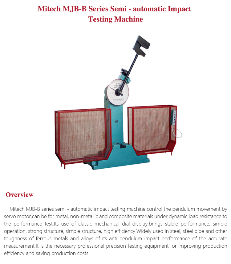 Product OverviewMitech MJB-B series semi - automatic impact testing machine ,control the pendulum movement by servo motor,can be for metal, non-metallic and composite materials under dynamic load resistance to the performance test.Its use of classic mechanical dial display,brings stable performance, simple operation, strong structure, simple structure, high efficiency.Widely used in steel, steel pipe and other toughness of ferrous metals and alloys of its anti-pendulum impact performance of the accurate measurement.It is the necessary professional precision testing equipment for improving production efficiency and saving production costs.
