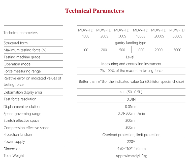 Product OverviewMitech MDW-TDS digital series of Single - Arm Spring Tension/Compression Testing Machine, through the single-chip automatic control motor driving screw movement, for a variety of coil springs for tensile and compression test. it use of built-in controller, AC servo motor, automatic control and data acquisition system, stable performance, strong structure, high reliability, simple operation, high degree of automation. Widely used in spring manufacturing, low-voltage electrical appliances, power machinery, institutions of higher learning and scientific research institutes and other fields.It is the necessary professional precision testing equipment for improving production efficiency and saving production costs.