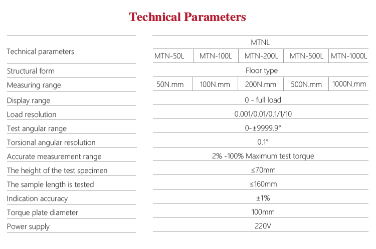 Structural form Floor type Measuring range 50N.mm Display range 0 - full load Load resolution 0.001/0.01/0.1/1/10 Test angular range 0-±9999.9° Torsional angular resolution 0.1° Accurate measurement range 2% -100% Maximum test torque The height of the test specimen ≤70mm The sample length is tested ≤160mm Indication accuracy ±1% Torque plate diameter 100mm Power supply 220V -
