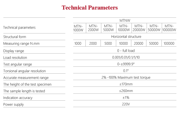 Structural form Horizontal structure Measuring range N.mm 5000 Display range 0 - full load Load resolution 0.001/0.01/0.1/1/10 Test angular range 0-±9999.9° Torsional angular resolution 0.1° Accurate measurement range 2% -100% Maximum test torque The height of the test specimen ≤170mm The sample length is tested ≤260mm Indication accuracy ±1% Power supply 220V -