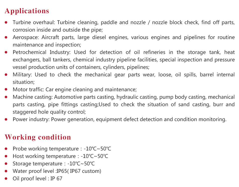 Probe diameter ɸ4, ɸ6, ɸ8,ɸ10(unit:mm) Field angle 70°/100° Depth of focus 20mm~∞ Brightness High brightness LED Brightness control 5 gears adjustable Camera pixels 450,000 1000,000 Video Output NTSC/PAL Storage 8 G (Micro SD Card,can be made to 32G) Picture format JPEG Video format AVI Frame rate 15~30 fps Line length 1m,1.5m,2m,can be customized Line material Tungsten wire / stainless steel / plastic coated Probe direction Electric 4 directions,up,down,left,right Screen size 5 inches Screen brightness 250cd/m2 USB port Mini-USB B type Battery Li-On rechargeable Shell material ABS Weight 1kg (main unit) -
