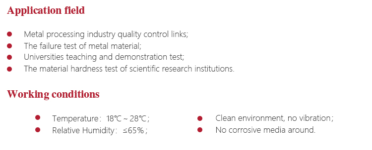 Working PrincipleHardness is not a simple physical quantity, but a reflection of the material elasticity, plasticity, strength and toughness .and hardness test is the most simple mechanical testing method to determine the metal material performance. Also one of the important means to judge the products quality.