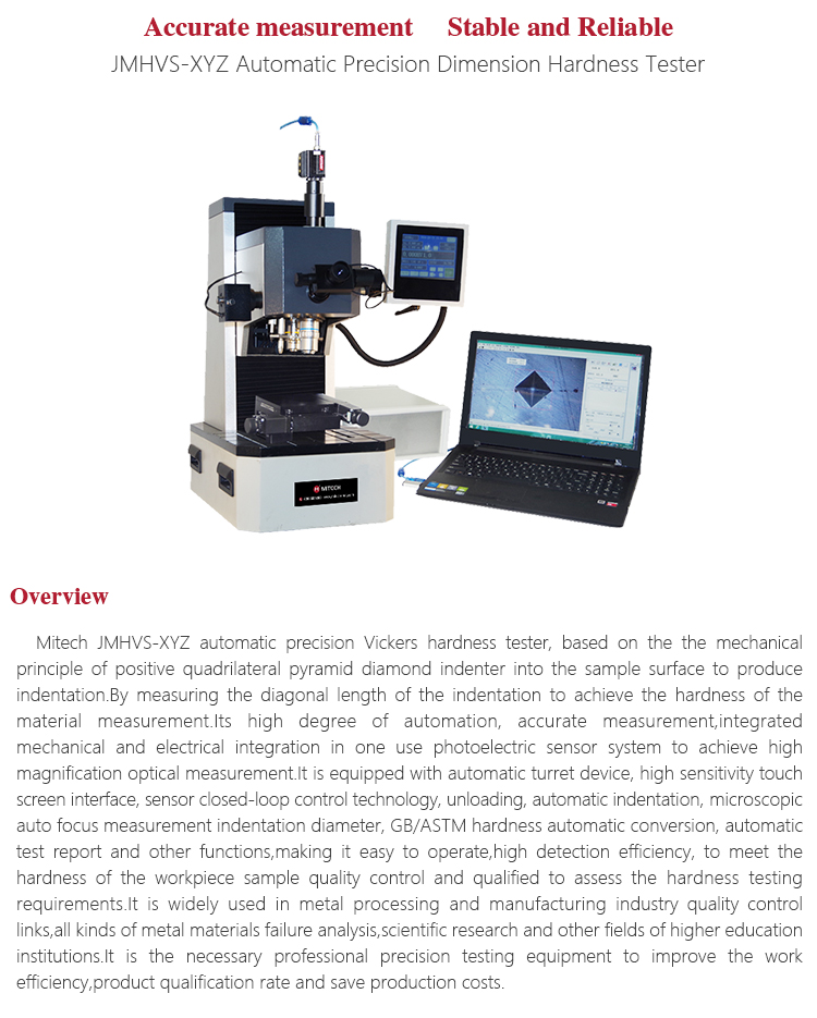 Product OverviewMitech JMHVS-XYZ automatic precision Vickers hardness tester, based on the the mechanical principle of positive quadrilateral pyramid diamond indenter into the sample surface to produce indentation.By measuring the diagonal length of the indentation to achieve the hardness of the material measurement.Its high degree of automation, accurate measurement,integrated mechanical and electrical integration in one use photoelectric sensor system to achieve high magnification optical measurement.It is equipped with automatic turret device, high sensitivity touch screen interface, sensor closed-loop control technology, unloading, automatic indentation, microscopic auto focus measurement indentation diameter, GB/ASTM hardness automatic conversion, automatic test report and other functions,making it easy to operate,high detection efficiency, to meet the hardness of the workpiece sample quality control and qualified to assess the hardness testing requirements.It is widely used in metal processing and manufacturing industry quality control links,all kinds of metal materials failure analysis,scientific research and other fields of higher education institutions.It is the necessary professional precision testing equipment to improve the work efficiency,product qualification rate and save production costs.