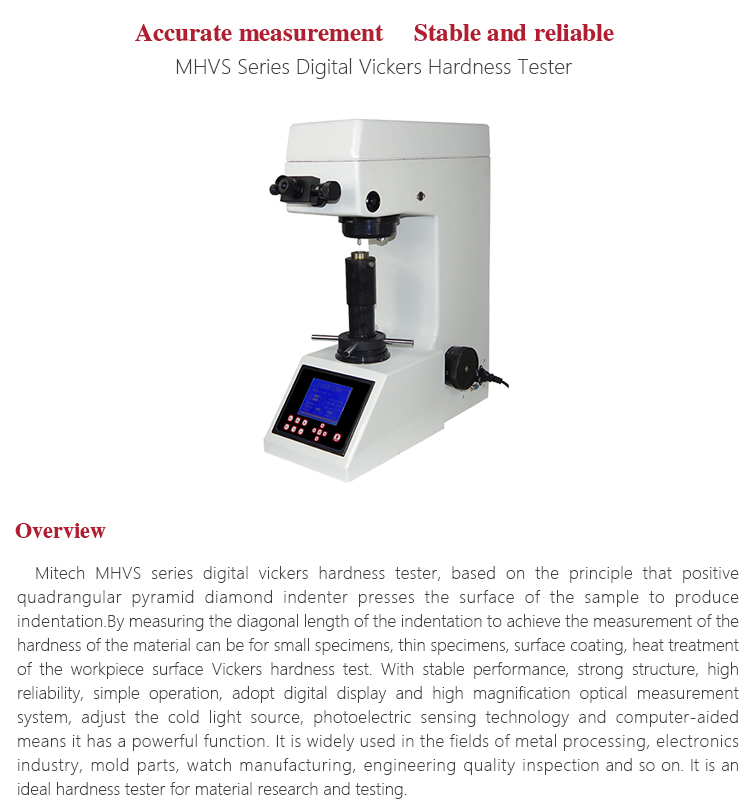 Product OverviewMitech MHVS series digital vickers hardness tester, based on the principle that positive quadrangular pyramid diamond indenter presses the surface of the sample to produce indentation.By measuring the diagonal length of the indentation to achieve the measurement of the hardness of the material can be for small specimens, thin specimens, surface coating, heat treatment of the workpiece surface Vickers hardness test. With stable performance, strong structure, high reliability, simple operation, adopt digital display and high magnification optical measurement system, adjust the cold light source, photoelectric sensing technology and computer-aided means it has a powerful function. It is widely used in the fields of metal processing, electronics industry, mold parts, watch manufacturing, engineering quality inspection and so on. It is an ideal hardness tester for material research and testing.