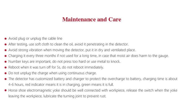 l High capacity lithium battery makes it portable, solves the drawbacks of traditional, magnetic particle detector relying on 220V. Low power consumption, small volume, alternative charge method, especially suitable for field and high altitude inspection.