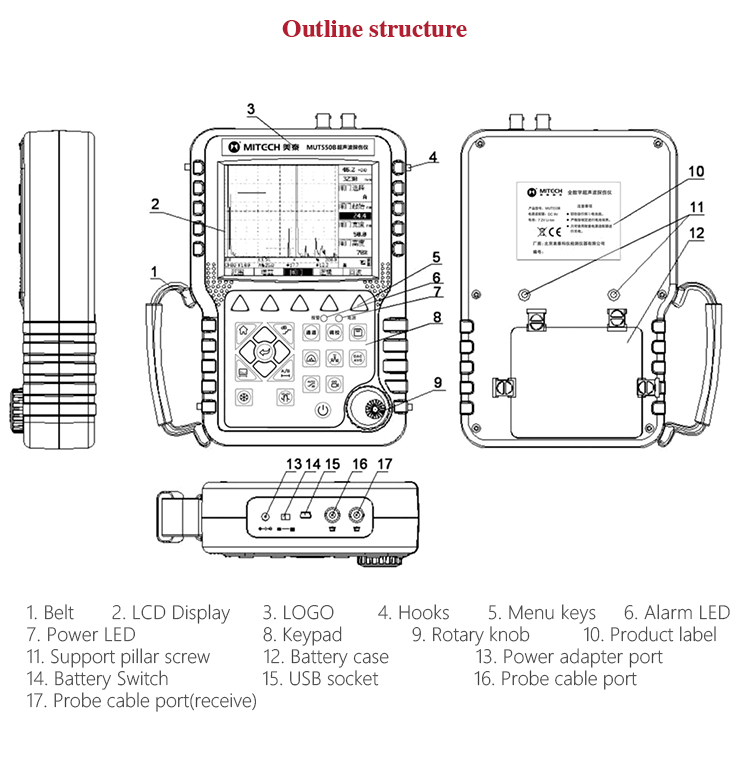 Based on ultrasonic principle, digital ultrasonic flaw detector MFD550B can test, orient, evaluate and diagnose various flaws such as crack, lard, air hole in workpiece’s interior swiftly and accurately without any destruction. With full digital 640X480 TFT LCD display, it show the defect clearly under the dim light and strong sunlight environment. 0-9999mm measuring range can meet the requirement for general defect inspection in manufacturing industry, metallurgical industry, metal processing industry, chemical industry and so on. Low power design with large capacity and high performance lithium ion battery module,it can work more than 10 hours continuously. Full English master-slave menu, emphasizing on user experience, collecting shortcut keys, digital shuttle rotary wheel, cross menu three operating ways inone body, customers with different habits can operate it freely. With comprehensive performance self-checking function, it can automatically generate test reports and support for many languages. With high cost performance, it is the smart choice for the practical economic model of ultrasonic testingequipment.